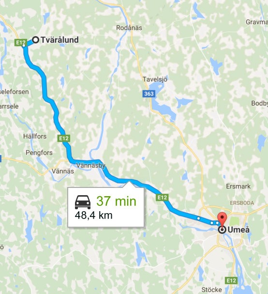 Det är smidigt att pendla mellan Umeå och Tvärålund. Det tar ca: 37 minuter med bil till centrala Umeå och sedan 2015 har vi en egen tågperrong. Tar man tåget så är man framme i Umeå på 35 minuter!