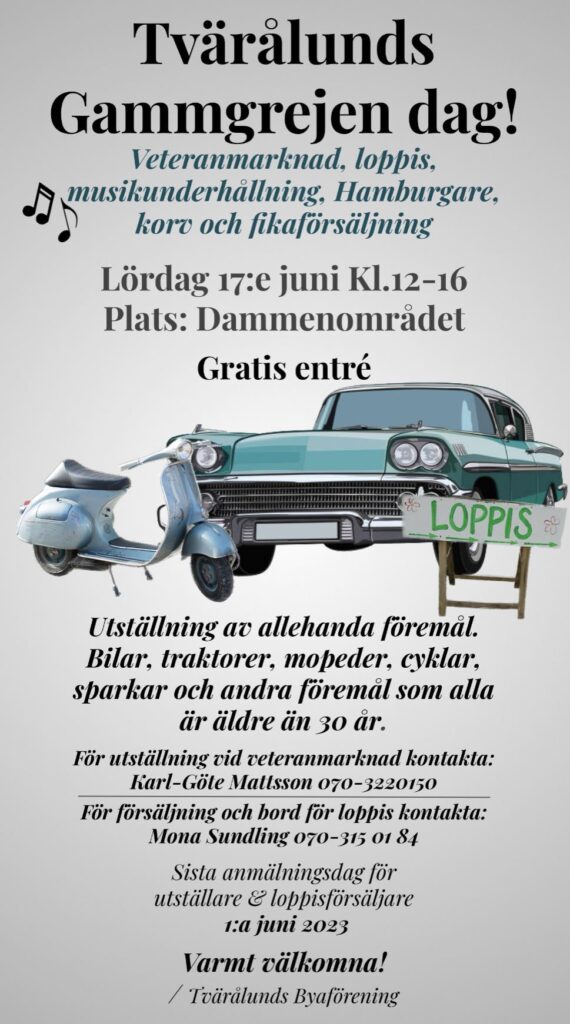 Veteranmarknad, loppis, musikunderhållning, hamburgare, korv och fikaförsäljning.